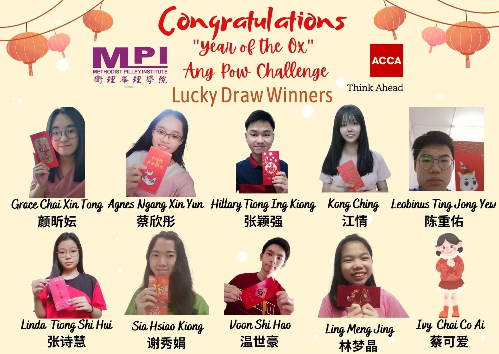 Methodist Pilley Institute and the Association of Chartered Certified Accountants (ACCA) jointly organized an online Ang Pow challenge for Chinese Lunar Year of the Ox. The purpose of this activity is to allow SPM Form 5 and UEC SM3 students in 2020 and 2021 to participate in online activities that are beneficial to their studies and exams, even when they are restricted by Movement Control Order and must study at home due to the epidemic. In addition, this event helped students relieve their stress from studying during these depressing times. The past 2020 was a difficult year, and 2021 was another year full of uncertainties and challenges. The organizers hope to encourage and bless the students with Ang Pow, as a token of good wishes for them to pursue their studies with perseverance and determination.