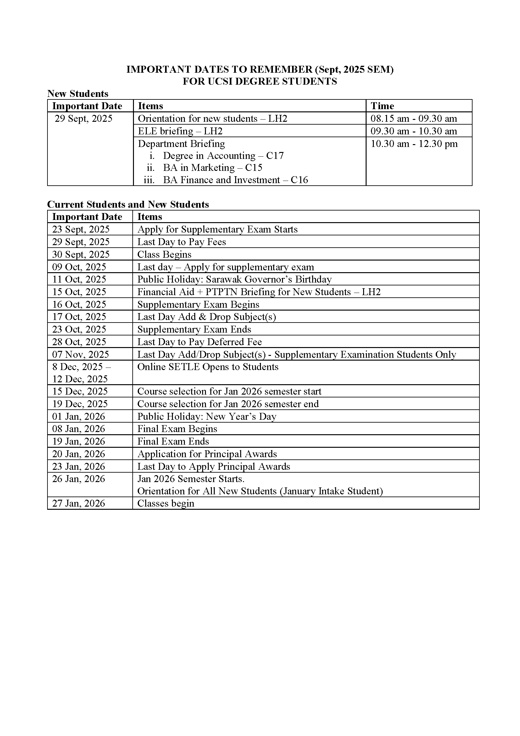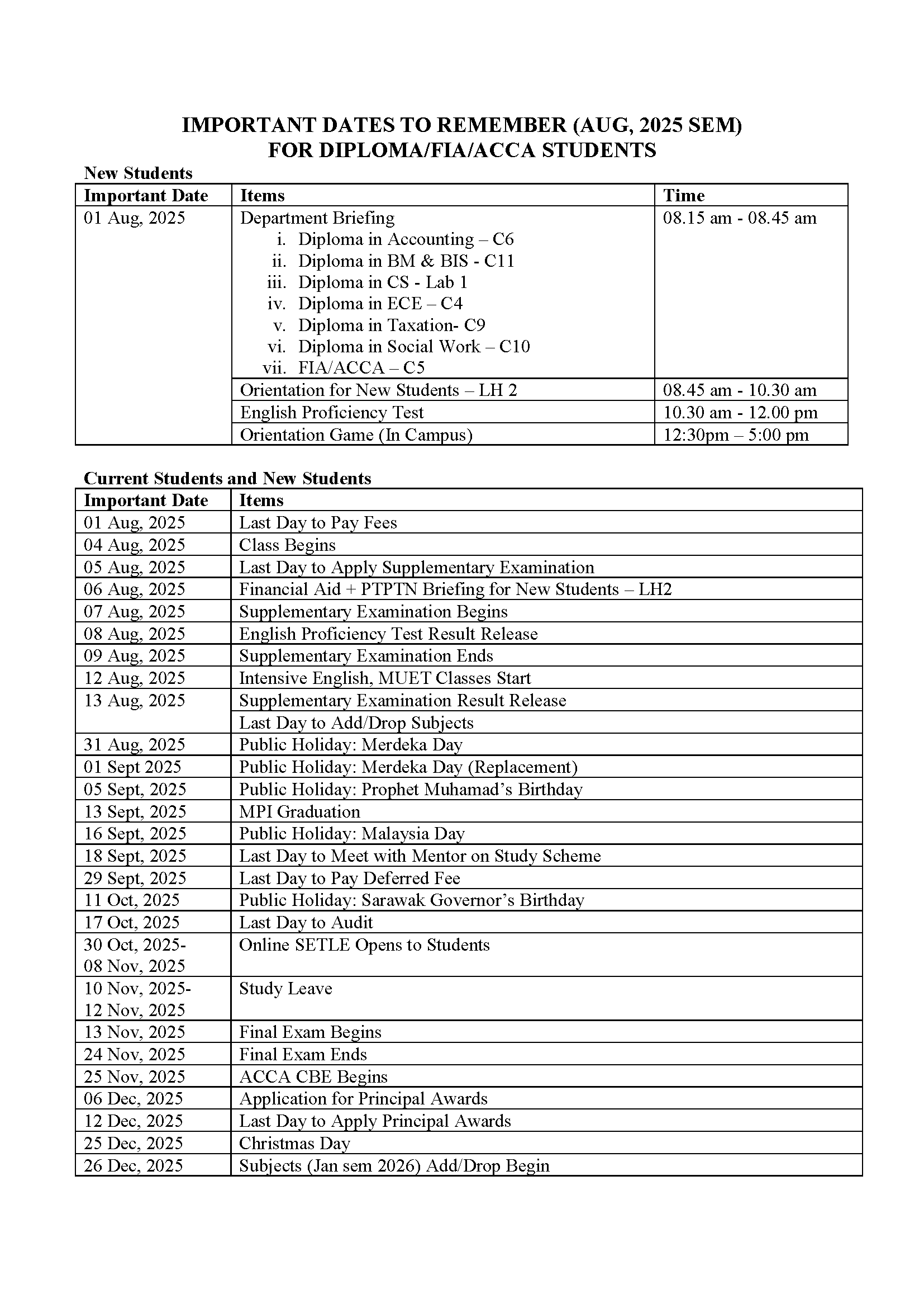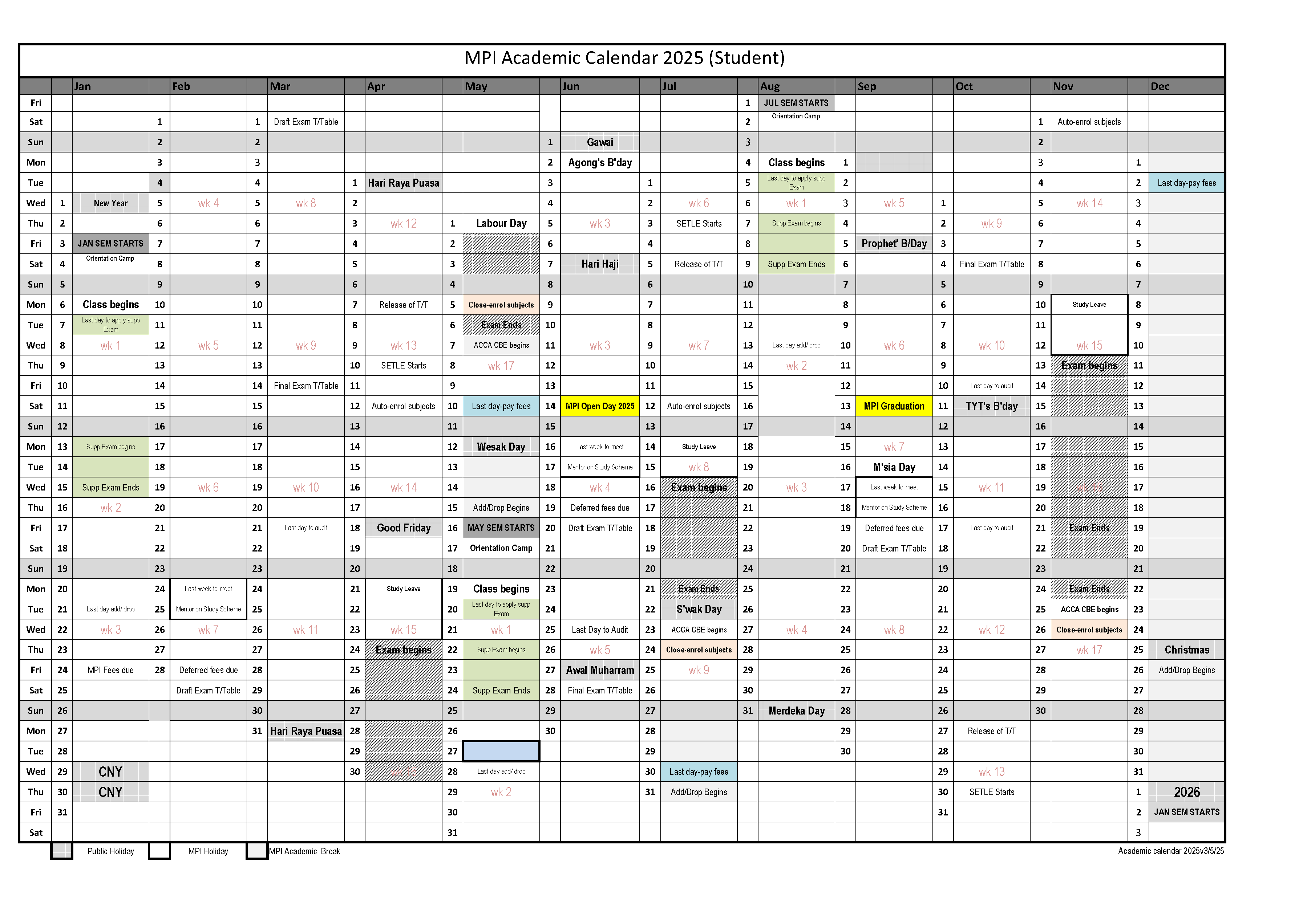 Key Dates – 2025 Diploma / FIA / ACCA August Semester Last update: 19 May 2025 UCSI September Semester Last update: 28 May 2025 BECE August Semester Last update: 19 May 2025 MPI Academic Calendar 2025 Academic Calendar Last update: 20 May 2025 MPI Academic Calendar 2026-2027 Academic Calendar Last update: 12 October 2025